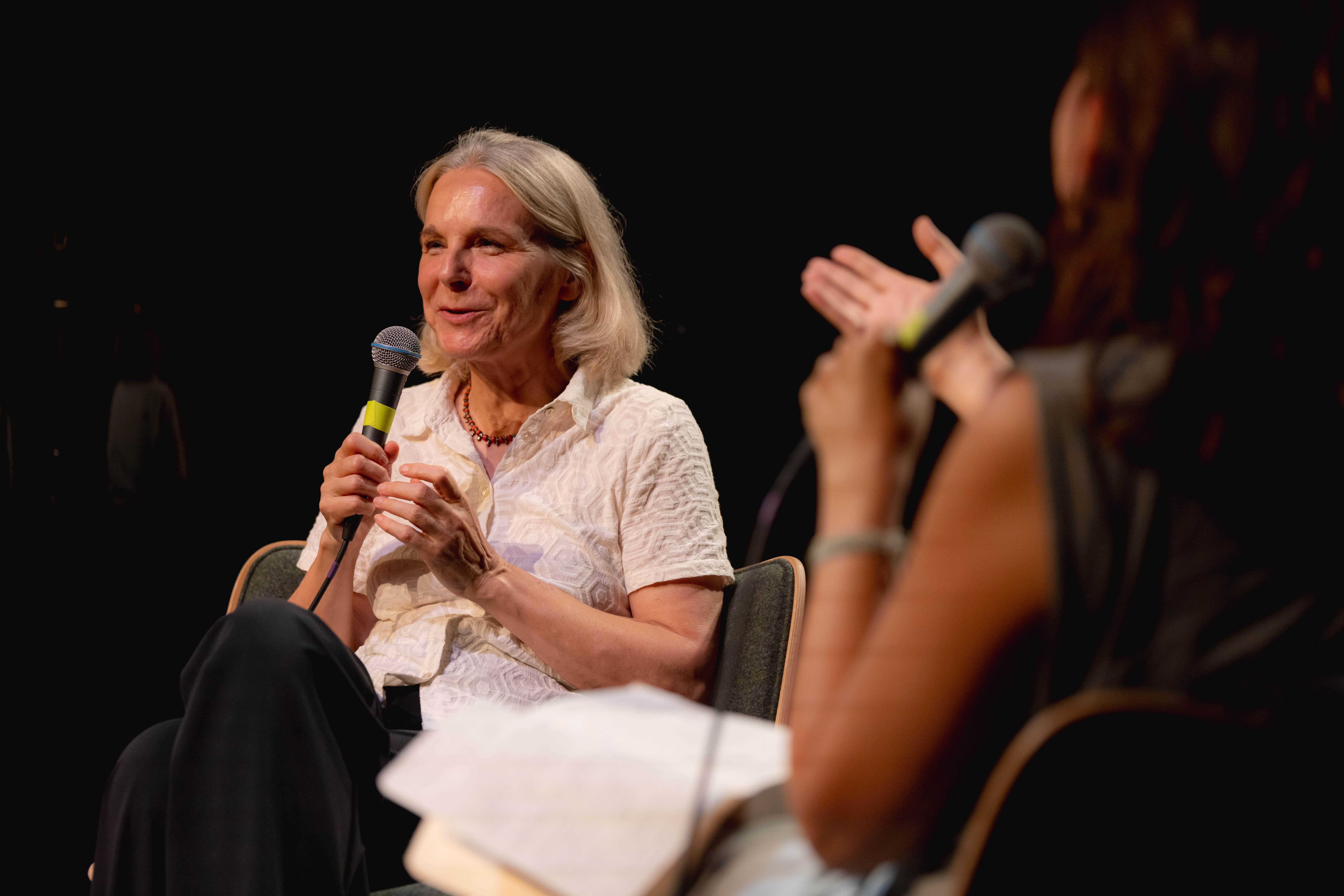 Invitée en 2023, elle était de retour avec la même ferveur, malgré la fatigue que suppose la tournée des salons. Pour elle, les festivals sont des instants de joie, d’élan collectif, presque scéniques, où la parole se vit à voix haute. Elle y cultive un dialogue exigeant avec les autres écrivaines, comme Valérie Zenatti ou Adèle Yon, et y célèbre la force des formes littéraires. Exploratrice du langage, elle avoue son amour du mot “malencontreusement” — rare, ironique, profondément français.