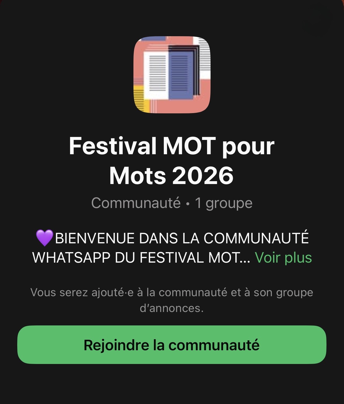 La communauté WhatsApp de MOT pour Mots vous donnera accès à toutes les infos utiles pendant le festival :
